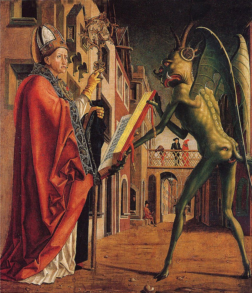 ศิลปินถ่ายทอดรูปลักษณ์ของปีศาจด้วยความน่าเกลียดน่ากลัว กายสีเขียว ผสมลักษณะของสัตว์ มีเขา ปีก และกรงเล็บ ปะทะกับภาพของนักบุญในอาภรณ์สีแดง หมวกทรงสูง และคทา อันเป็นสัญลักษณ์ของบิชอป โดยเฉพาะอย่างยิ่งสายตาที่มุ่งมั่นตั้งใจในการต่อกรเหนือปีศาจ ถือเป็นการจัดวางและถ่ายทอดอารมณ์ได้อย่างตรงไปตรงมาแต่ทรงพลัง