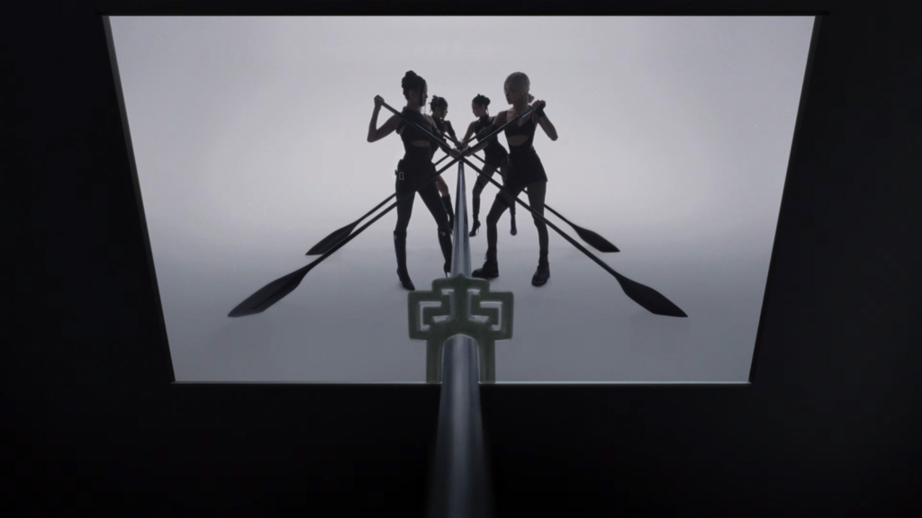 หลายคนน่าจะเคยเห็นการพายเรือกรรเชียงลักษณะนี้ ฝีพายทุกคนจำเป็นต้องฝึกซ้อมให้พร้อมเพรียงกัน หัวใจสำคัญคือ ‘ความสามัคคี’ ถ้าฝีพายไม่สอดประสานกัน เรือก็ไม่แล่น จะเห็นได้ว่ามีหลายซีนมากๆ ที่ตั้งใจโฟกัสความเท่า-ประสานกัน ของสมาชิก สิ่งนี้อาจสื่อได้ว่า แม้ช่วงที่ผ่านมาทั้ง 4 สาวจะแยกย้ายไปปังในเส้นทางโซโล่ระดับโลกของตัวเอง แต่เมื่อกลับมารวมตัวกัน พวกเธอยังคงเชื่อมโยงเป็นหนึ่งเดียว ขาดใครไปไม่ได้ และพร้อมจะขับเคลื่อน BLACKPINK ไปข้างหน้าด้วยกัน