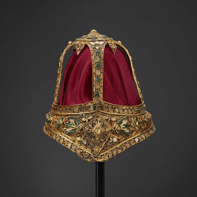 ทีเด็ดอยู่ที่ฝ่ายหญิง ! เครื่องแต่งกายของสตรีในราชสำนักอยุธยา ถูกออกแบบให้อลังการสมฐานะ อย่างศิราภรณ์ ‘เทริดยอดแหลม’ ของ ‘พระวิสุทธิกษัตรีย์’ แรงบันดาลใจจากศิราภรณ์ของเทวรูปพระนางปารวตีสมัยสุโขทัย มงกุฎสวมครอบศีรษะ มีกรอบหน้า ทำจากทองคำดุนลาย ประดับพลอย และมียอดซ้อนชั้น ปรากฎมาก่อนใน ‘แม่หยัว’ (พ.ศ. 2567) เป็นศิราภรณ์ของแม่หยัวศรีสุดาจันทร์ งามตาแตกสมมงขัตติยะนารีแห่งอยุธยา