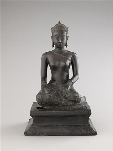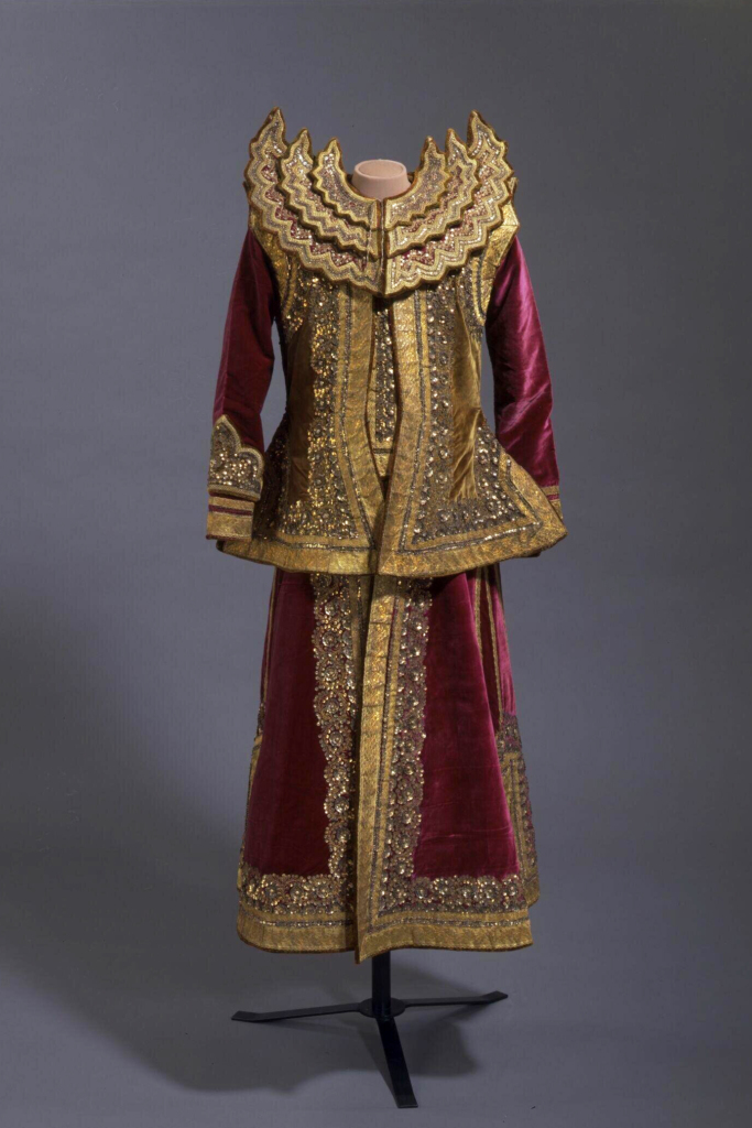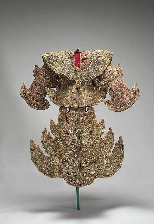 อีกหนึ่งคือศิราภรณ์ของ ‘พระสุพรรณกัลยา’ นั่นคือ ‘พระมาลาทองคำ’ ซึ่งถอดแบบมาลาพระมาลาในสมัยอยุธยาเช่นกัน โดดเด่นด้วยลายก้านขด และการประดับพลอยสีแดงโดยรอบ รวมถึง ‘เสื้อป้าย’ แขนกระบอก ซึ่งถอดแบบมาจาก ‘ประติมากรรมสตรี’ สมัยอยุธยา ซึ่งจัดแสดงอยู่ในพิพิธภัณฑ์กีเมต์ (Musée Guimet) กรุงปารีส ร่วมกับหลักฐานจิตรกรรม ถือเป็นงานออกแบบที่ตีความจากหลักฐานใหม่ ๆ จากโบราณวัตถุ มาสู่งานเครื่องแต่งกายที่สวมใส่ได้จริง