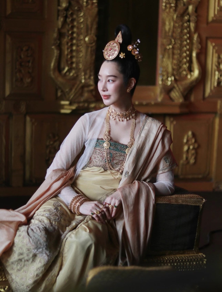 อีกหนึ่งชุดที่เป็นกระแส นั่นคือ ชุดของ ‘พระนางนัตซีนแมดอ’ (ผิงผิง ณิชา ปิยะวัฒนานนท์) แสดงลักษณะของสตรีพม่าชั้นสูงเช่นกัน ด้วยผ้าซิ่นยาวระดับอก ผ้าคลุมไหล่พาดเฉียงปล่อยชายผ้าให้ยาวลากพื้น โดดเด่นด้วยสีสันสดใสฉูดฉาด ไม่แพ้ความแซ่บของตัวละคร อีกอย่างคือทรงผมที่สะดุดตา ไม่ว่าจะเป็นผมยาวแบบสตรีพม่า หรือ ผมทรงมวยสูงที่ประดิษฐ์เป็นรูปทรงต่าง ๆ แรงบันดาลใจมาจาก ‘ทรงแบบราชสำนัก 55 แบบ’ ซึ่งใช้ในพม่าสมัยอังวะ สืบเนื่องมายังสมัยคองบอง แต่ละทรงจะมีชื่อเรียกเฉพาะ ตามรูปแบบที่ได้แรงบันดาลใจมา เช่น ดอกบัว เกลียวคลื่น หรือ งวงช้าง โดยจะประดับกับเครื่องประดับทองคำ และดอกไม้ไหว