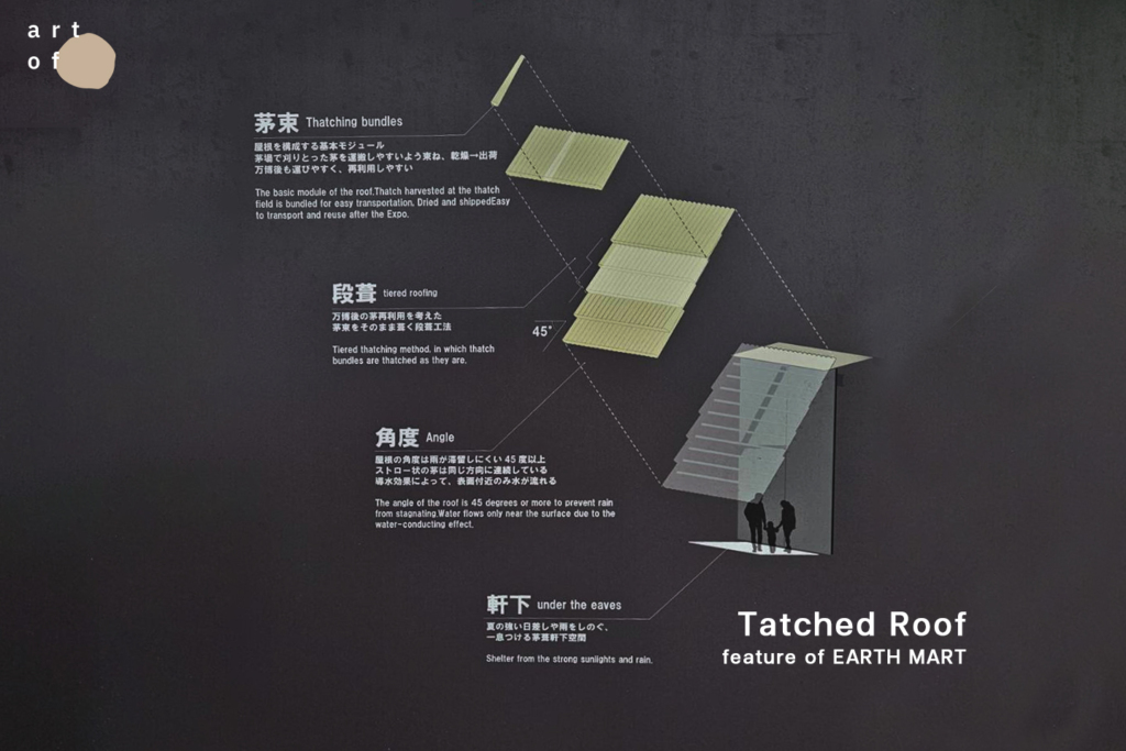 EARTH MART ถูกออกแบบให้มีลักษณะคล้าย “กระท่อมมุงหญ้า” (thatched hut) ที่เรียบง่ายและอบอุ่น ให้ความรู้สึกย้อนกลับสู่รากเหง้าวิถีพื้นบ้านของญี่ปุ่น ดึงให้ผู้เข้าชมได้กลับมารู้สึกถึงคุณค่าของชีวิตและธรรมชาติอีกครั้ง