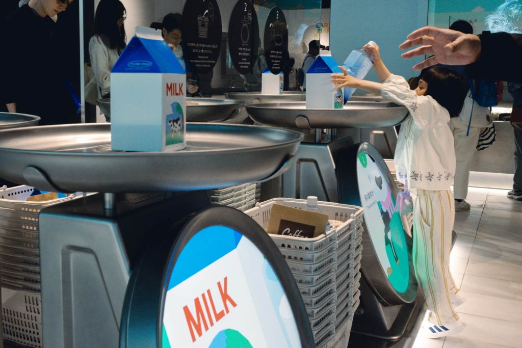 ภายในโซนแรกมาในบรรยากาศของ ‘ตลาด’ พร้อมกับของคุ้นเคยที่เราซื้อกลับบ้านกันอยู่ทุกวัน พร้อมตาชั่งและแผงไข่ แต่ความน่าสนใจอยู่ที่การเล่าเรื่อง
