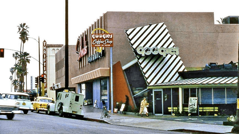 ชื่อ “Googie” มาจากร้าน Googie’s Coffee Shop ในลอสแอนเจลิส ซึ่งสถาปนิก John Lautner ออกแบบใหม่ในปี 1949 ตัวอาคารใช้โครงสร้างและเส้นสายที่ดูล้ำยุค เน้นการมองเห็นได้จากระยะไกล และคำว่า Googie จริงๆ มาจากชื่อเล่นของภรรยาเจ้าของร้านนั่นเอง