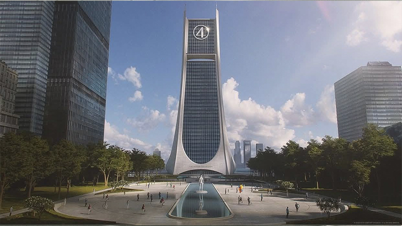 Fantastic Four (2025) Baxter Building ออกแบบให้มีโทนสีน้ำเงินวินเทจและรูปทรงโค้งที่สะท้อน Googie เพื่อสื่อถึงยุคทองของวิทยาศาสตร์