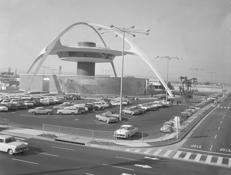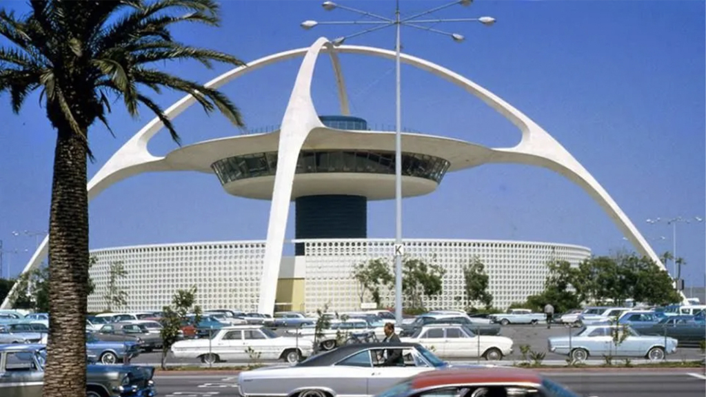 “LAX Theme Building (1961)” อาคารสนามบินลอสแอนเจลิส ที่มีรูปทรงคล้ายยานอวกาศขนาดยักษ์ ลอยตัวเหนือพื้นด้วยโครงเหล็กโค้งยักษ์ ”