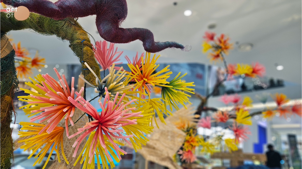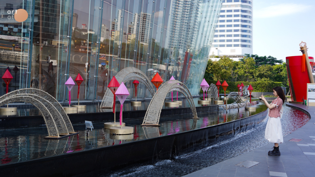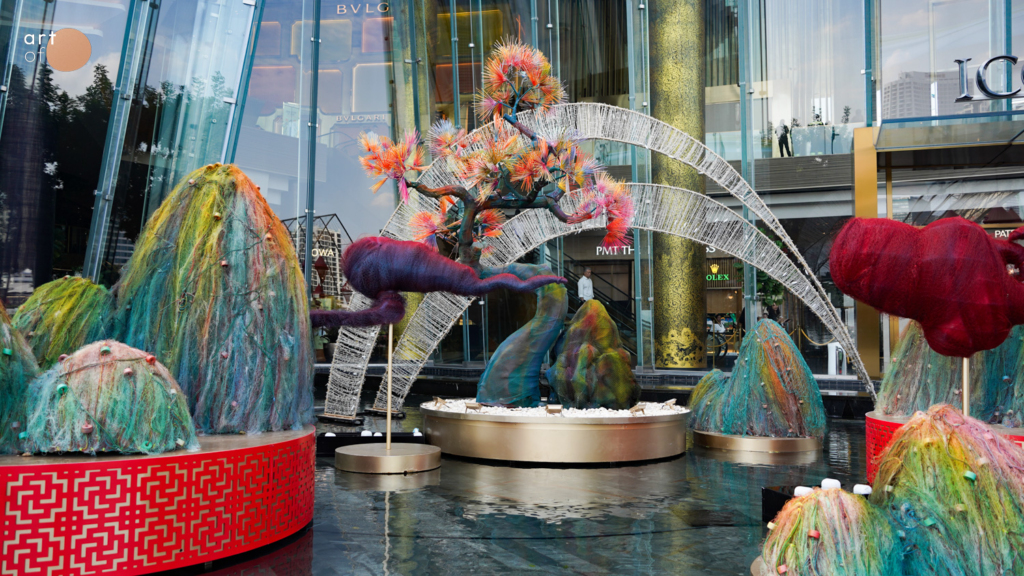 ความน่าสนใจของงานชิ้นนี้ คือการตีความศิลปะข้ามวัฒนธรรม โดยศิลปินได้หยิบเอา ‘ม้วนภาพวาดอวยพร’ ของขวัญล้ำค่าในวัฒนธรรมจีนที่ปกติเราเห็นเป็นภาพ 2 มิติ มาปลุกให้มีชีวิตในรูปแบบประติมากรรม 3 มิติขนาดยักษ์ เสมือนภาพวาดเหล่านั้นกำลังพวยพุ่งออกมาสู่โลกความจริง