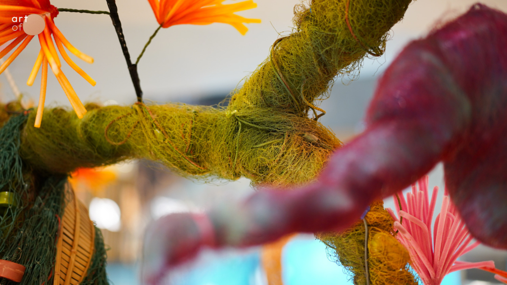 ขึ้นโครงสร้างจากไม้ไผ่ หุ้มห่อด้วย ‘อวนประมงเก่า’ และ ‘ฟางข้าว’ เมื่อนำมาถักทอรวมกัน จะเกิดเป็นผิวสัมผัสที่มีความพลิ้วไหว อ่อนช้อย ดูแล้วให้ความรู้สึกเหมือนลายเส้นพู่กันจีนอย่างน่าอัศจรรย์ แม้แต่โคมไฟสีสด ก็ประยุกต์ทำมาจากร่มบ่อสร้างจาก จ.เชียงใหม่
