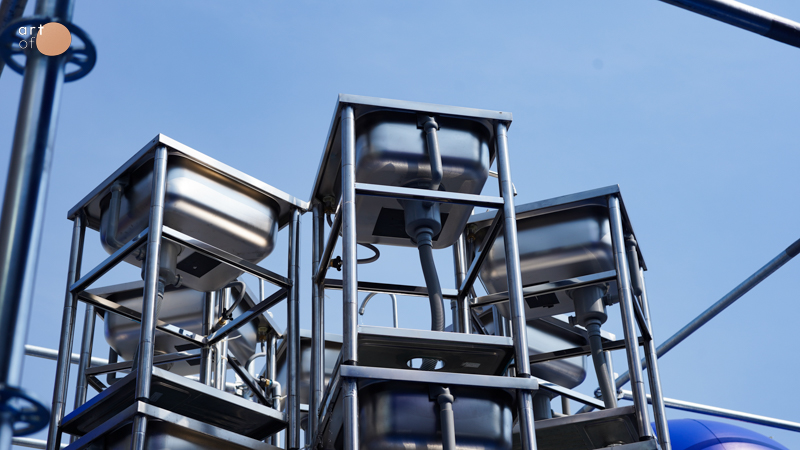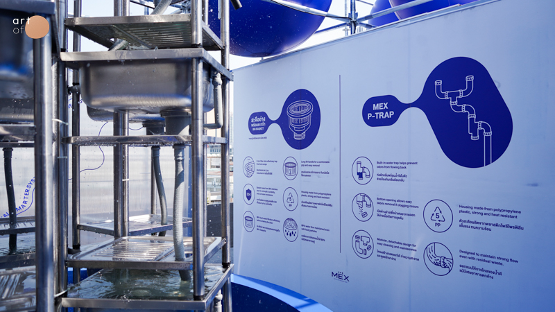 ประติมากรรมน้ำพุ ที่ประกอบจากซิงค์ล้างจานมากมาย ซึ่งนอกจากจะน่าประทับใจด้วยรูปทรงแปลกตาแล้ว ยังสะท้อนปัญหาเล็กๆ ในครัวทุกบ้านซึ่งมักถูกมองข้าม นั่นก็คือการล้างจานและเศษอาหารที่ไหลลงท่อ แนวคิดนี้ถูกนำเสนอทางแก้ด้วย ‘ตะกร้าสะดือซิงก์ดีไซน์ไม่อุดตัน’ ของ MEX ที่สามารถกรอง แยก และกักเศษอาหารตั้งแต่ต้นทาง ลดการอุดตันในบ้าน ลดต้นทุนการบำบัดน้ำเสีย และลดผลกระทบสิ่งแวดล้อมในภาพรวมอีกด้วย