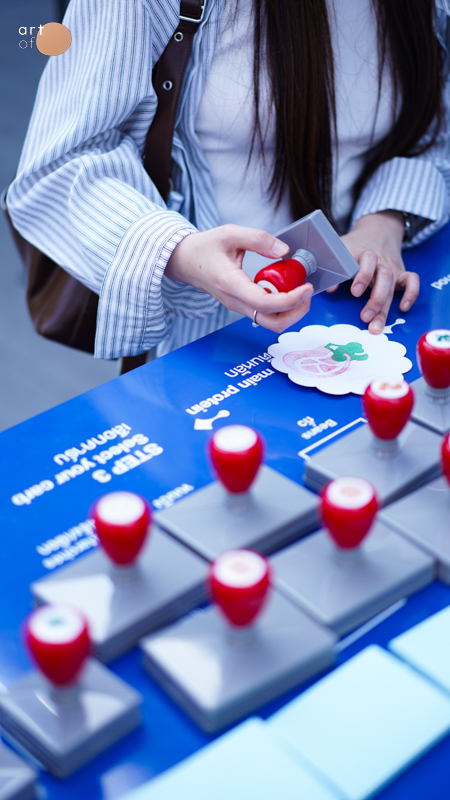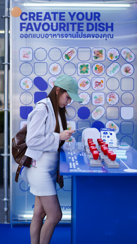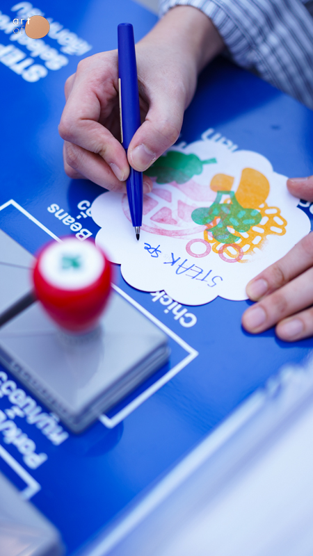 ในโซนนี้มีการนำเสนอองค์ประกอบในอาหารต่างๆ ให้ทุกคนออกแบบเมนูเองได้ โดยมีตราปั๊มวัตถุดิบหมวดแป้ง โปรตีน และผัก ให้ลองจับคู่รวมกัน และตั้งชื่อเมนูใหม่ กิจกรรมนี้ส่งเสริมให้คนรุ่นใหม่เห็นคุณค่าของการ ‘เข้าครัวทำอาหารกินเอง’ โดยให้มองการทำอาหารไม่เพียงแค่เป็นกิจกรรมพื้นฐานในชีวิตประจำวัน แต่เป็นการลงทุนเวลาเพื่อสุขภาพที่ดี ไม่ใช่การเสียเวลา