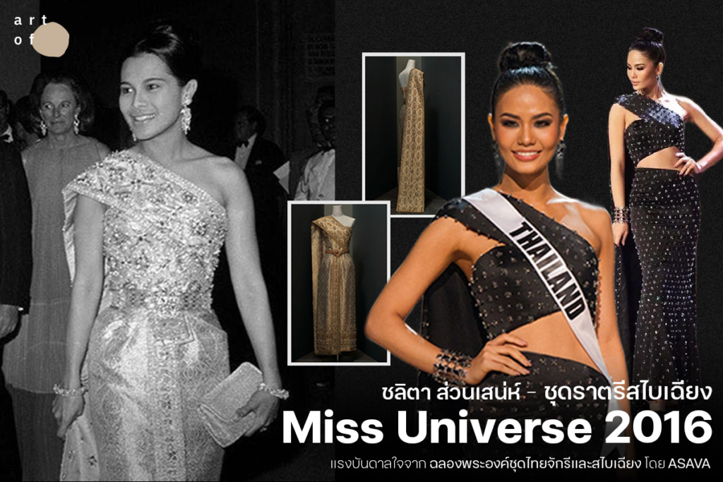นอกจากชุดประจำชาติที่เป็นภาพจำอันโดดเด่นของประเทศไทย ในการประกวดมิสยูนิเวิร์ส 2016 ที่ประเทศฟิลิปปินส์แล้ว อีกหนึ่งเครื่องแต่งกายที่เป็นที่จดจำไม่แพ้กันคือ ‘ชุดราตรีสไบเฉียง’ ซึ่งน้ำตาล ชลิตา ส่วนเสน่ห์ ได้สวมใส่ในรอบคัดเลือก 6 คนสุดท้าย โดยแบรนด์ ‘อาซาว่า (ASAVA)’ ถือเป็นหมุดหมายสำคัญที่ได้พลิกโฉมหน้าของวงการแฟชั่นนางงามไทย โดยเปลี่ยนจากการนำเสนอที่เน้นความหวือหวาไปสู่ความเรียบง่ายเชิงโครงสร้างที่อิงจากรากฐานทางวัฒนธรรม
