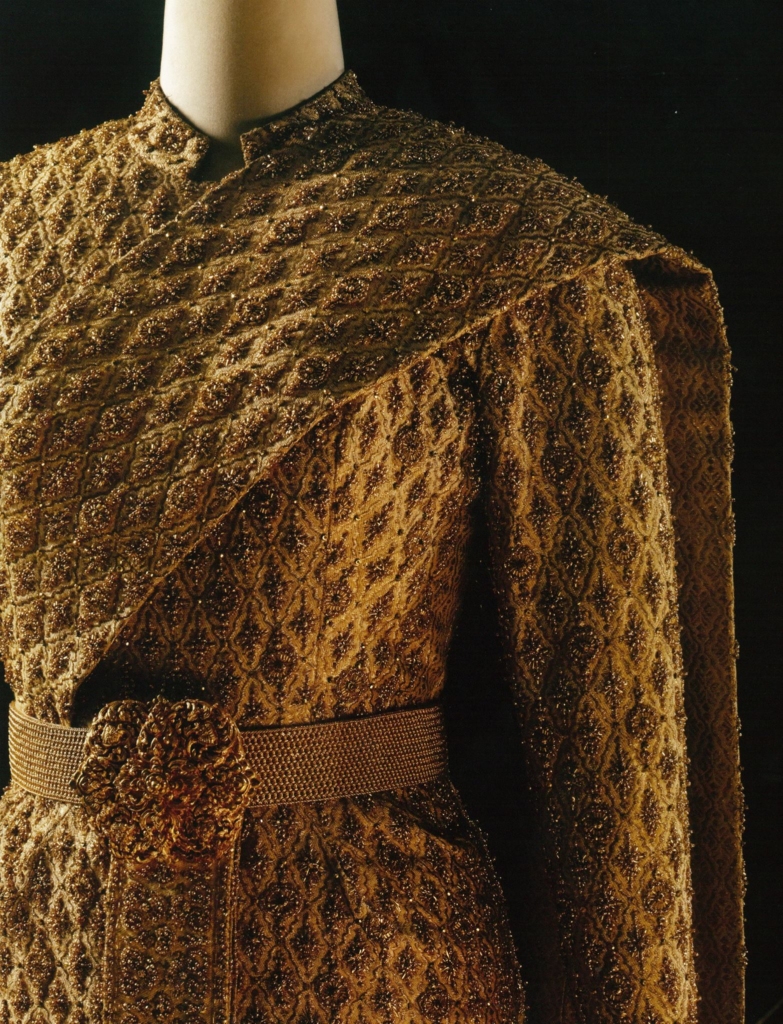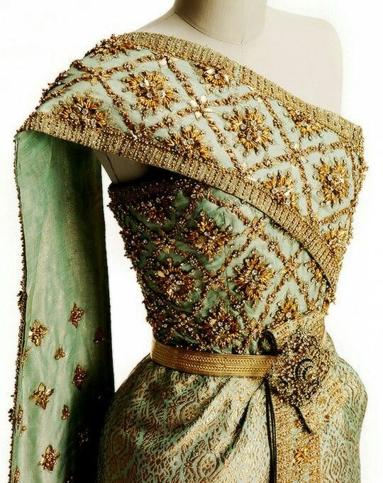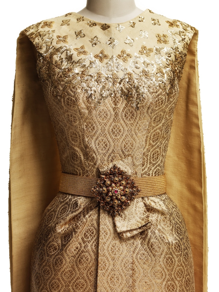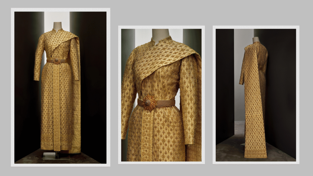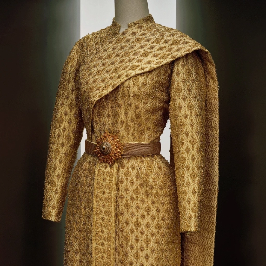 งานปักใช้ดิ้นทองผสมกับเพชรและคริสตัลจำนวนกว่า 300,000 เม็ด ส่งให้ชุดเปล่งประกายระยิบระยับเมืองต้องแสงไฟ นอกจากนี้ยังมี ‘รัดเกล้ายอด’ ซึ่งเป็นเครื่องศิราภรณ์ชั้นสูง ช่วยส่งเสริมให้ภาพรวมสวยงามโดดเด่น ถือเป็นก้าวสำคัญที่ได้สร้างบรรทัดฐานใหม่สำหรับการออกแบบชุดประจำชาติในอนาคต