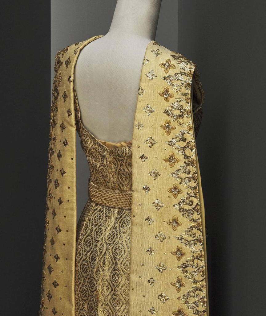 แบบของชุดอ้างอิงจากมรดกทางแฟชั่นของ ‘สมเด็จพระนางเจ้าสิริกิติ์ พระบรมราชินีนาถ’ นั่นคือ ‘ฉลองพระองค์ชุดไทยศิวาลัย’ ซึ่งเป็น 1 ใน 8 แบบของชุดไทยพระราชนิยม เสื้อแขนยาวจรดข้อมือ คอกลมมีขอบตั้งขึ้นเล็กน้อย ห่มทับเสื้อด้วยสไบเฉียงที่มีชายเดียว ตัดเย็บจากผ้าไหมยกทอง ปักประดับเลื่อมและลูกปัด ออกแบบโดย ‘ปิแอร์ บัลแมง (Pierre Balmain)’ ทรงในการเสด็จฯ ไปในงานถวายการเลี้ยงพระกระยาหารค่ำแด่สมเด็จพระราชินีนาถเอลิซาเบธที่ 2 และดยุคแห่งเอดินเบอระ ณ พระที่นั่งจักรีมหาปราสาท ในพระบรมมหาราชวัง กรุงเทพฯ เมื่อปี พ.ศ. 2515