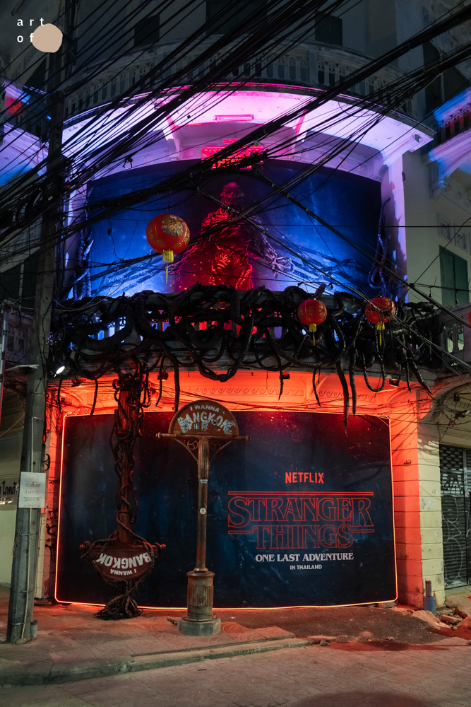 อีกจุดแลนด์มาร์กย่านทรงวาดที่ถูกพลิกโฉมให้เสมือนอยู่ในโลกกลับด้าน ตั้งอยู่บริเวณมุมถนน เส้นสายที่เลื้อยของสิ่งมีชีวิตจากโลกกลับด้าน ดูจะเข้ากันได้ดีกับสายไฟยุ่งเหยิง และโคมจีนในย่านนี้ ป้ายถนนเองก็ดูมาจากทั้งสองโลก และยังมี Vecna ปรากฏอยู่ด้านบนให้ตกใจเล่นอีกด้วย