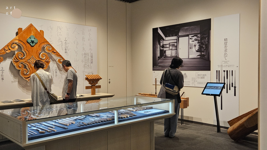 เริ่มเล่าตั้งแต่ประวัติศาสตร์ของงานไม้ มีการจัดแสดงอุปกรณ์ช่างไม้แบบต่างๆ ไม่ต้องแปลกใจถึงความขึ้นชื่อของช่างไม้ญี่ปุ่น เพราะอุปกรณ์ที่ใช้มีความเฉพาะเจาะจงและหลากหลายขนาด เพื่อให้ได้ความแม่นยำในการทำงานมากที่สุด สาวๆ ที่คิดว่ามีแปรงแต่งหน้าเยอะแล้ว ยังต้องหลบให้ช่างไม้ญี่ปุ่นกับอุปกรณ์ของเขา