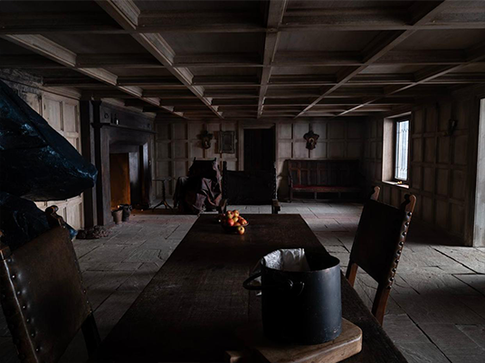 บ้านแสนหดหู่ที่ Catherine และ Heathcliff เติบโตมาด้วยกัน ดูยิ่งใหญ่ ทะมึน ท้าแรงลมบนภูเขา ส่วนด้านในบ้านก็เป็นสีสันและลวดลายที่ทำให้เกิดความอึดอัด ทั้งฝ้าเพดานและพื้นที่เป็นลวดลายตาราง เหมือนทำให้ตัวละครต้องอยู่ในกรอบและความกดดันเสมอ ฝ้าเพดานในครัวที่ต่ำจนเมื่อ Heathcliff มายืนก็เกือบจะไม่พ้นความสูงของเขา